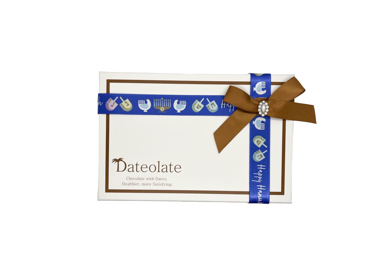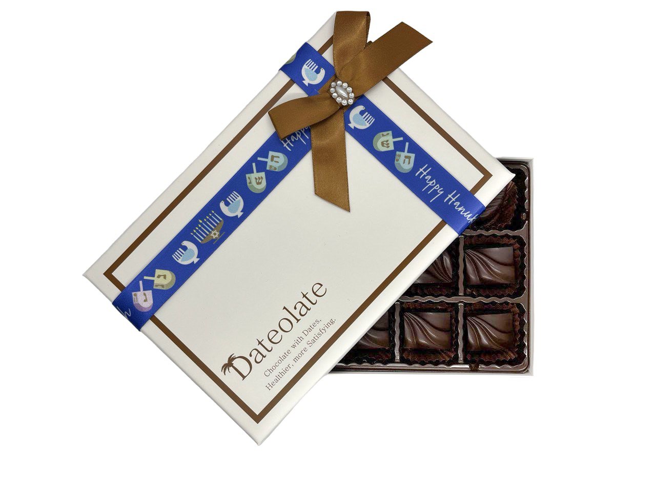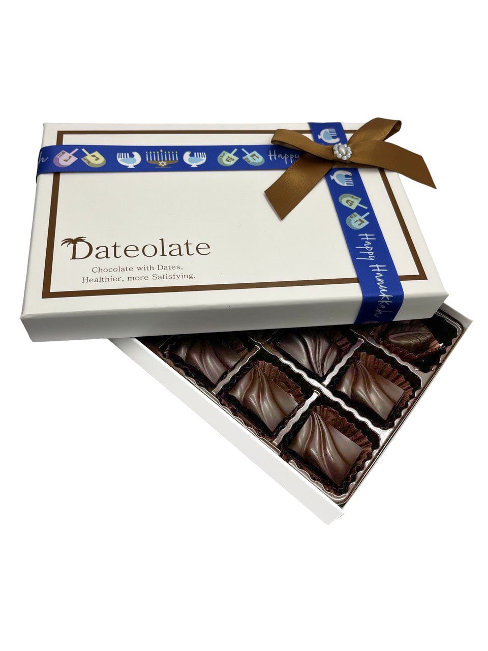 Our delicious Hannukah Dates Chocolates are prepared with Kosher ingredients and adhere to Kosher preparation guidelines. With only 33 calories per piece, these make the perfect gift for Hannukah and they even come packaged in a special Hannukah-themed box!